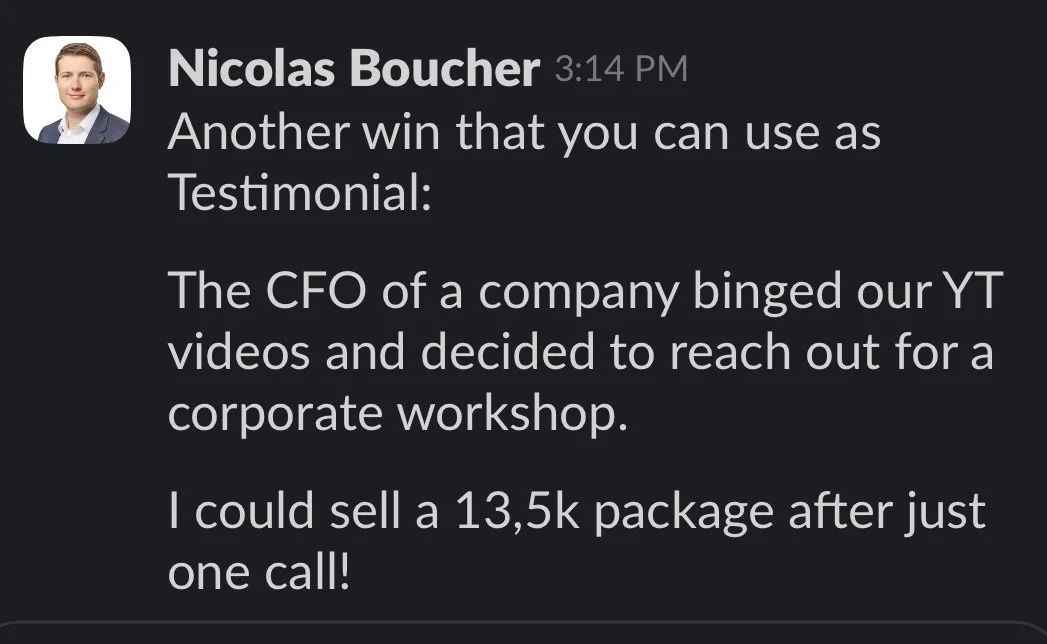 When we started working together, he had almost no activity on Youtube and barely any subscribers. In 10 months, we grew the channel to 13k+ subscribers, getting members for his paid community and signing high ticket corporate deals, like the one you can see below for €13.5k.